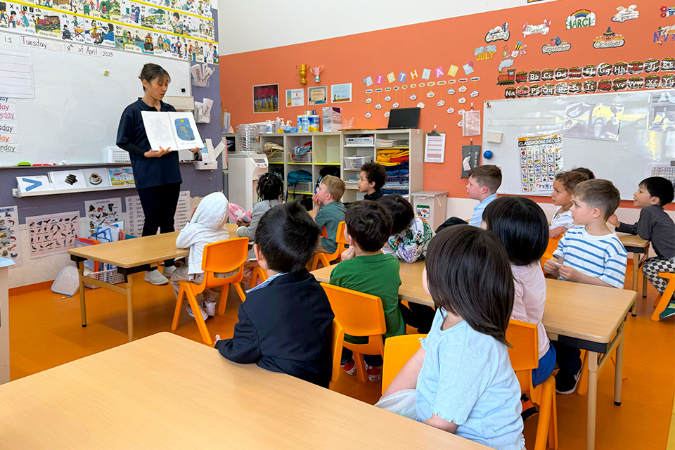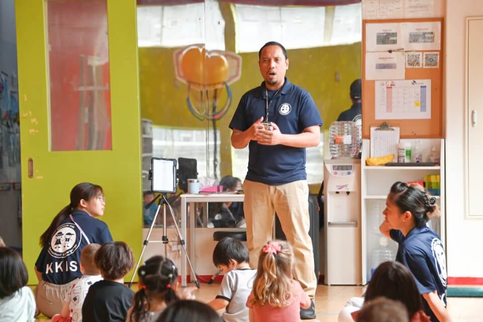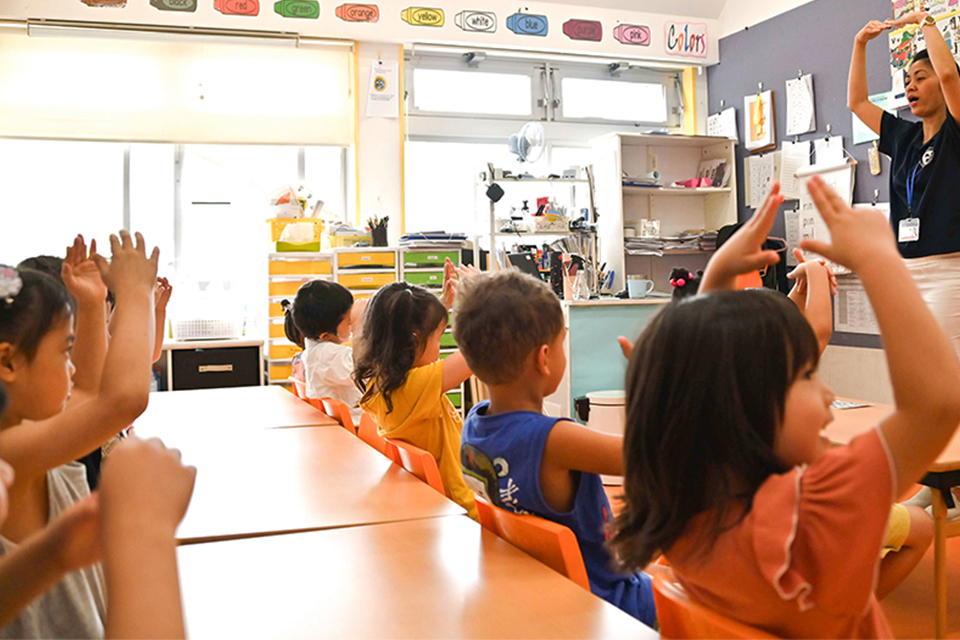 英語のあいさつや歌を歌ったりします